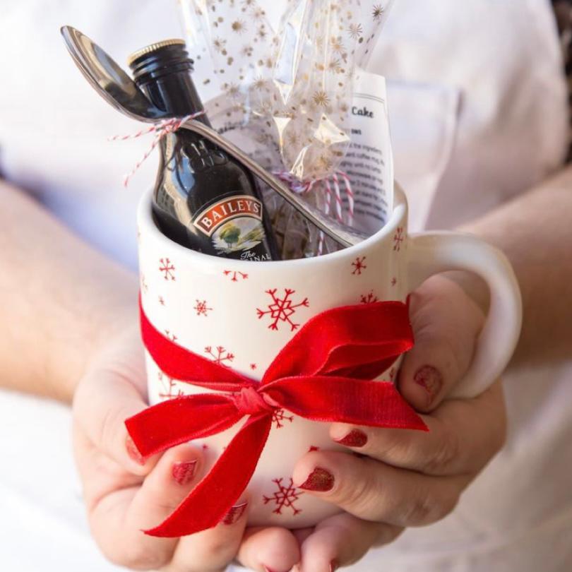 Desain satu ini akan sangat anggun bila Anda ingin menciptakan hampers kecil dan sederhana. Cukup siapkan satu cangkir atau mug bernuansa natal dan ikatlah dengan pita merah yang cantik.