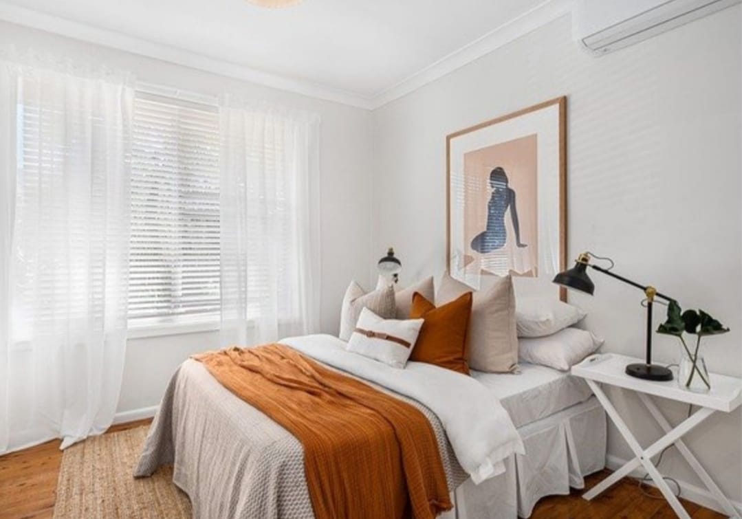 Setelah itu, kombinasikan dengan warna terang pada perabot kamar, seperti memakai sarung bantal warna krem, selimut oranye, dan lampu meja warna hitam.